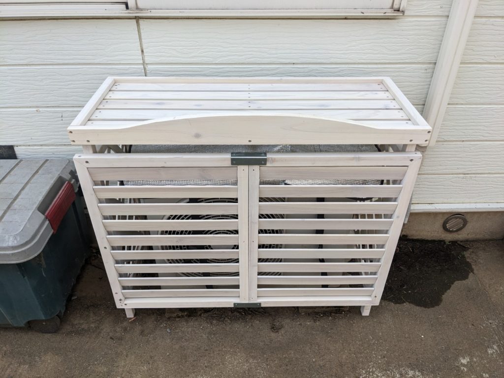 猛暑対策として、エコアクション21の取組みの一環でエアコン室外機に専用カバーを設置しました。